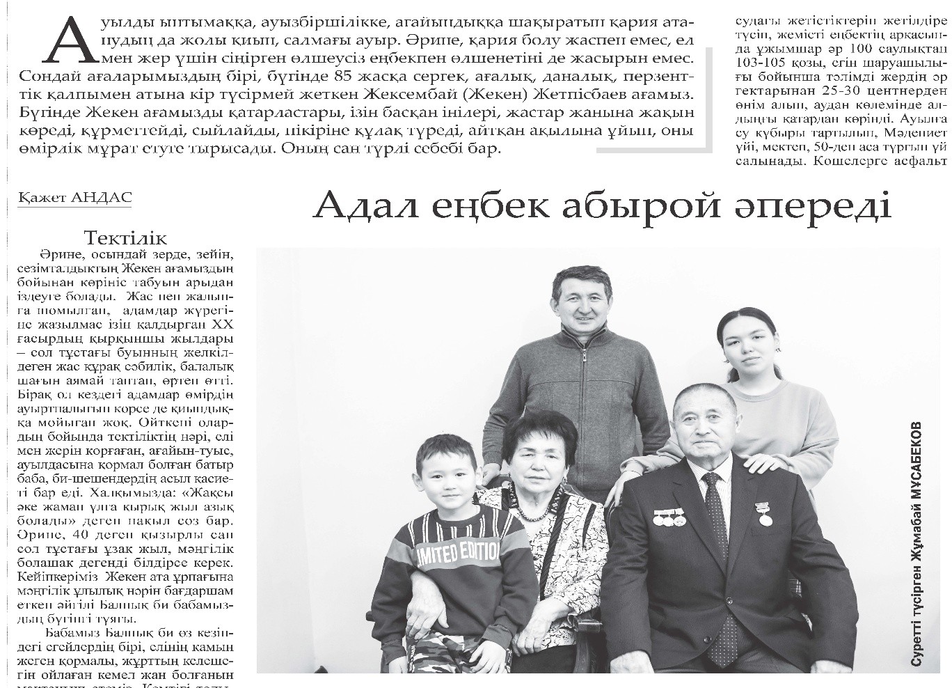 Сол қатардан ең алдымен Жекен ағамызды көретініміз анық. Өйткені, мен ол кісіні танығалы ширек ғасырға жуық уақыт өтті. Аймақта өткен ақсақалдардың жиналыстарында, ұрпақ болашағы үшін ой бөліскен шараларда жиі кездесіп жүрдік. Сондағы сабаз қимылы, салиқалы сөзі, ортасын ұйытып әкететін ойлы пікірлеріне іштей сүйсінетінмін. Осы мақаланы жазу барысында сол игі қасиеттердің төркінін білгендей болдым. Ол – тектілік.