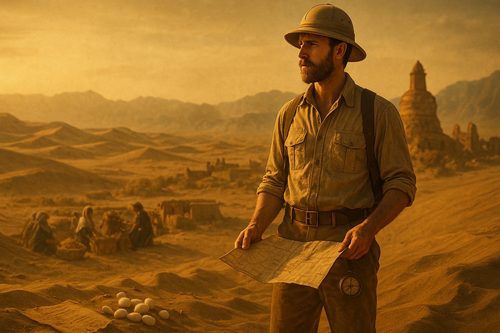 1900 жылдың шілде айы. Стивен бір жылдық демалысын пайдаланып, үнділік өлшеу маманы Рамкингті және бірнеше қара жұмысшыны ертіп, Черия тау сағасынан Шыңжаңның Тасқорға үңгіріне өтеді. Одан әрі Қашқарға, кейін Хотанға жетеді.